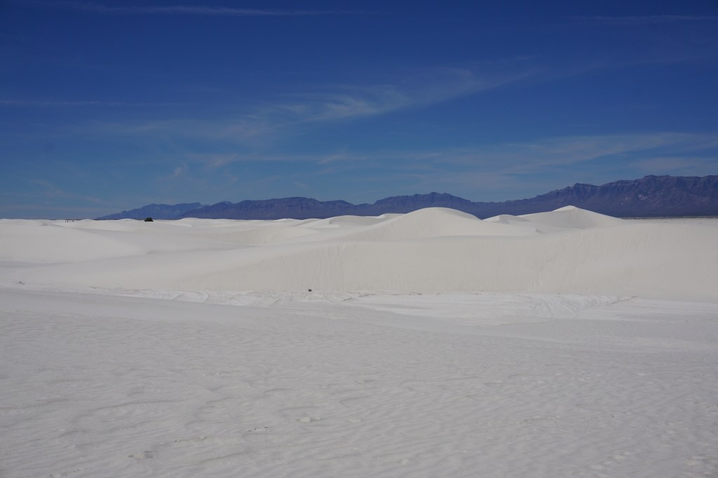 We left the parking lot around 5am towards White Sands NM and arrived about 745am. We head towards Alkali Flat Trail, a 5mi RT through dunes with the San Andreas Mountains in the background.