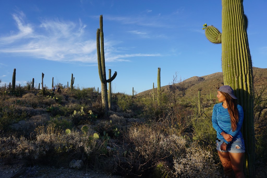 I learned my lesson from the day before and made sure to book a room before it got dark. While driving, Carolyn pitched the idea we go to Saguaro National Park and hit up a trail there.The drive on Cactus Forest Drive on the East side is peaceful. Large saguaros throughout.