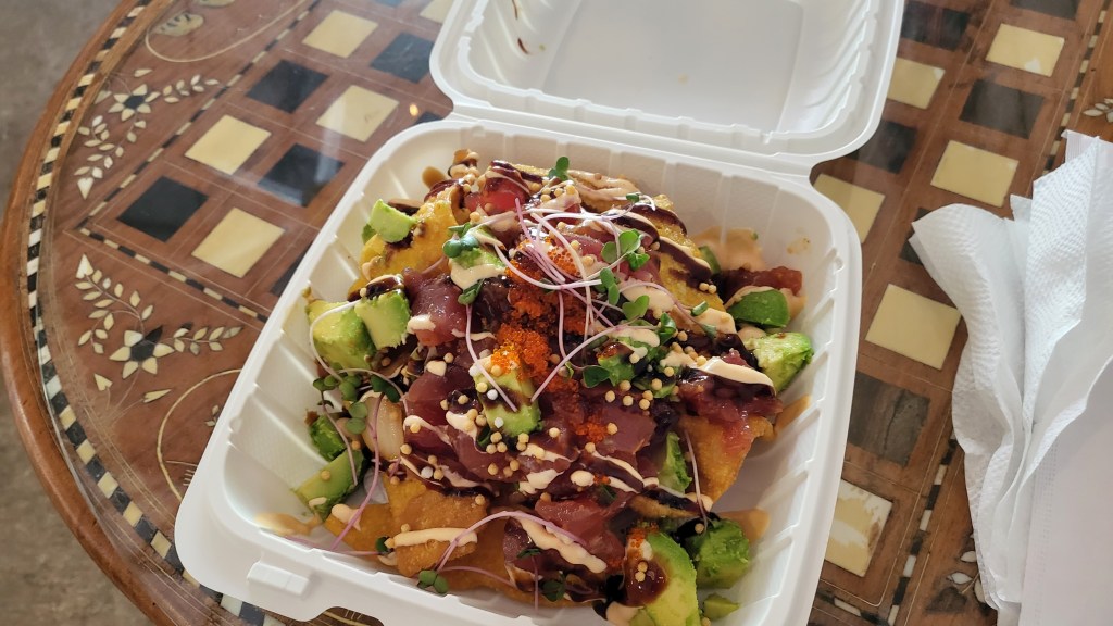 On the drive back to Kiahuna Plantation we stopped by a spot called Red Dirt Waterfall. The area seemed straight out of Mars. We ended up talking to some local hunters who generously offered us some goat (sadly had to turn them down). A couple of them worked in a power plant in the area when they were younger. Right across the waterfall offers another amazing view at the Waimea Canyon. For dinner, we stopped by a restaurant called by Da Booze Shop. Despite the name, there isn’t any alcohol (or tobacco) in the property (you can learn the background of the name when you visit). Instead they have delicious food. We ordered mahi katsu and furikake fries, and let me tell you, that mahi katsu hit.