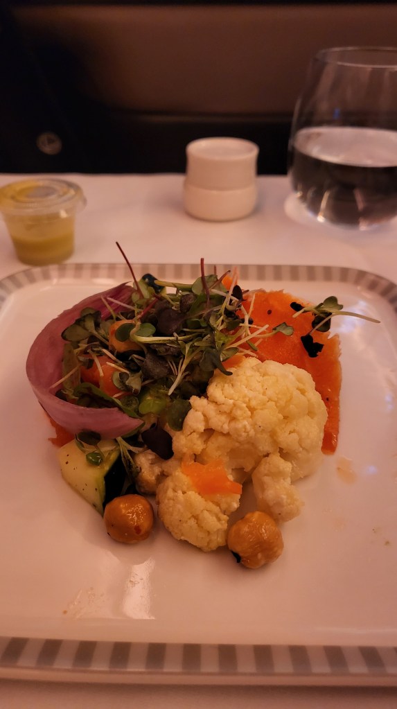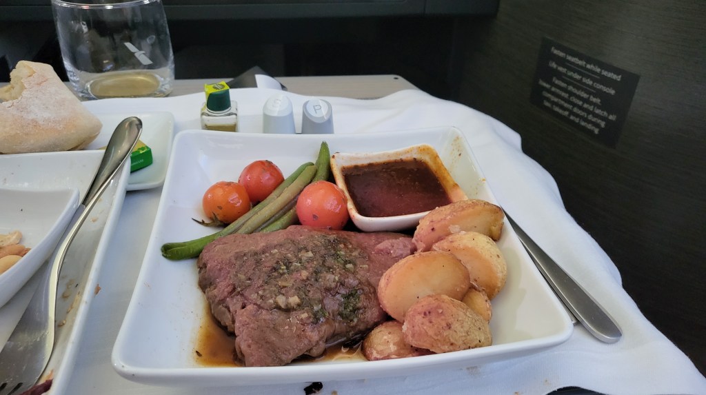 AA First Class (F) MIA-SAN was ok. I was tired at this point and just wanted to get home. First time flying F domestic- the extra space was nice but don’t think it’s much of an upgrade. Don’t remember what I ate for dinner, but I do remember liking it more than the AA J. Real shitty part though was the bathroom got clogged 2hrs before arrival lol.