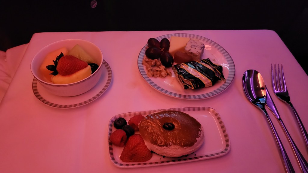American Airlines (AA) J BCN-MIA was ok. SQ J definitely skewed my expectations. The plane was showing it’s age. Had the flank steak for dinner and it was bland. Go for the salmon, that seems to be what everyone ordered. I liked the little amenity pouch they gave. Also liked their snack cart that you have access to any time during the flight. The flight attendant informed me I finished their Glenlivet 12, oops.