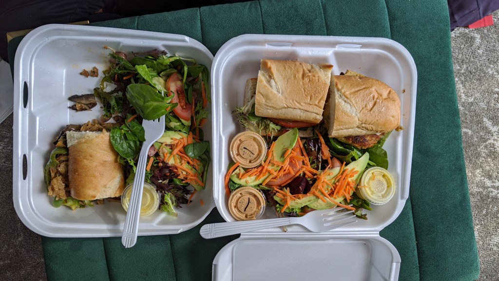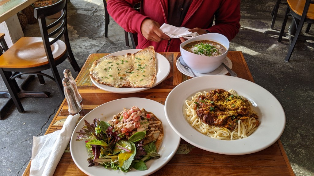 Waking up the next day was tough. We eventually got out of bed with the help of the hair of the dog and got some breakfast at a vegan restaurant called Carmo. This was our breakfast, at 2p. The food here was delicious and the portions were huge. We had to detour back to the hotel and drop off leftovers.